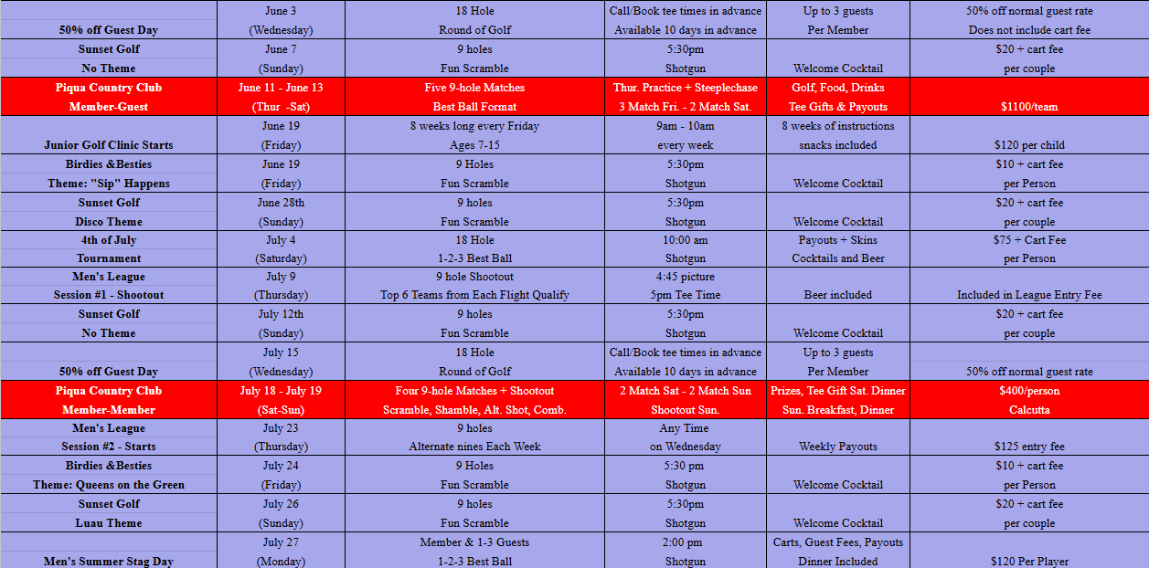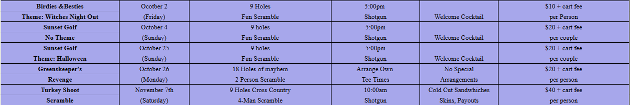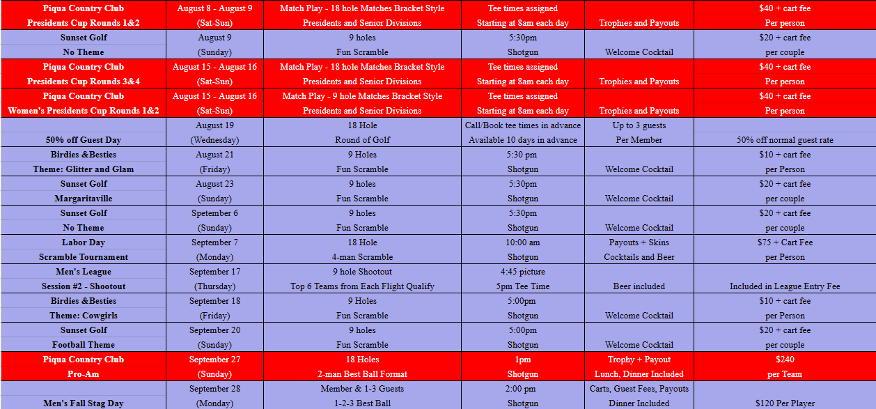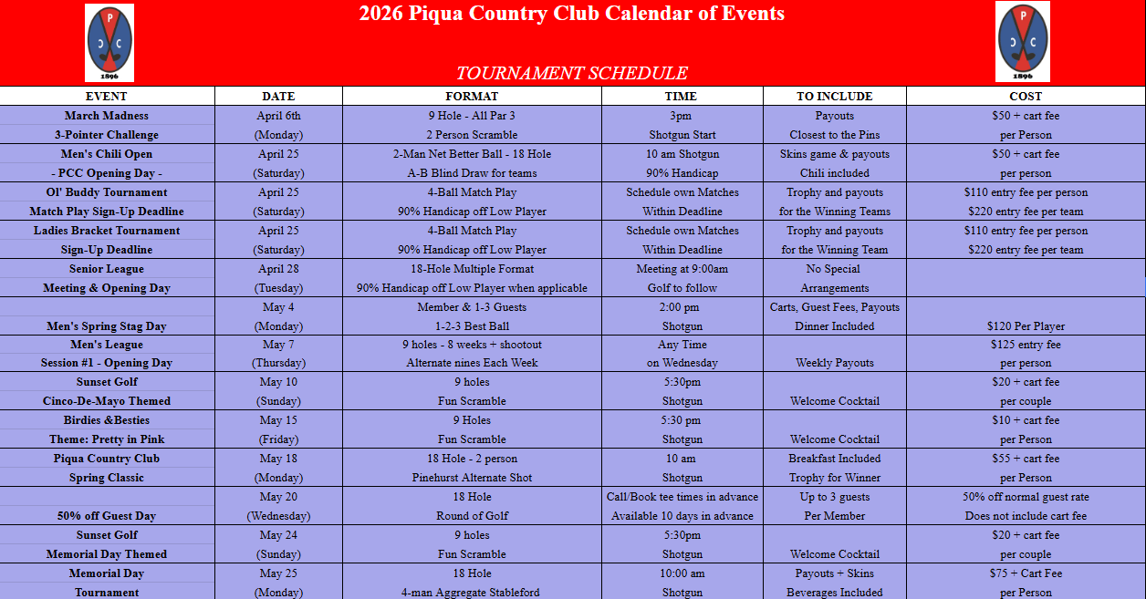 Golf Calendar of Events